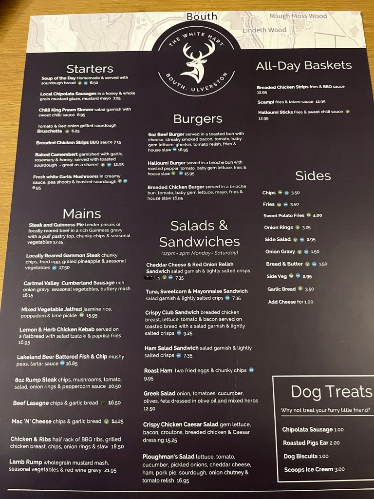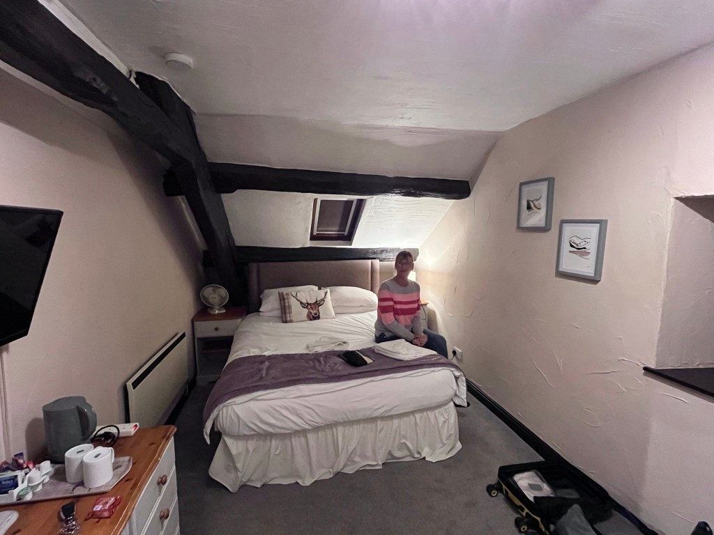 Situated in the village of Bouth, near Ulverston in the south Lake District. The White Hart is a small Inn with some half a dozen rooms. The rooms are not luxurious but they are unique and quirky, heavy beams mean you have to be careful as you move about and that includes sitting on the loo and getting in and out of the bath! Our room, number 3 had no shower but a shower head on a flex controlled by the bath taps – you couldn’t have a shower fitted over the bath if you were over 1m tall. The floor is sloping so my wife kept rolling downhill in bed and ending up next to me – I thought it was romance!!.