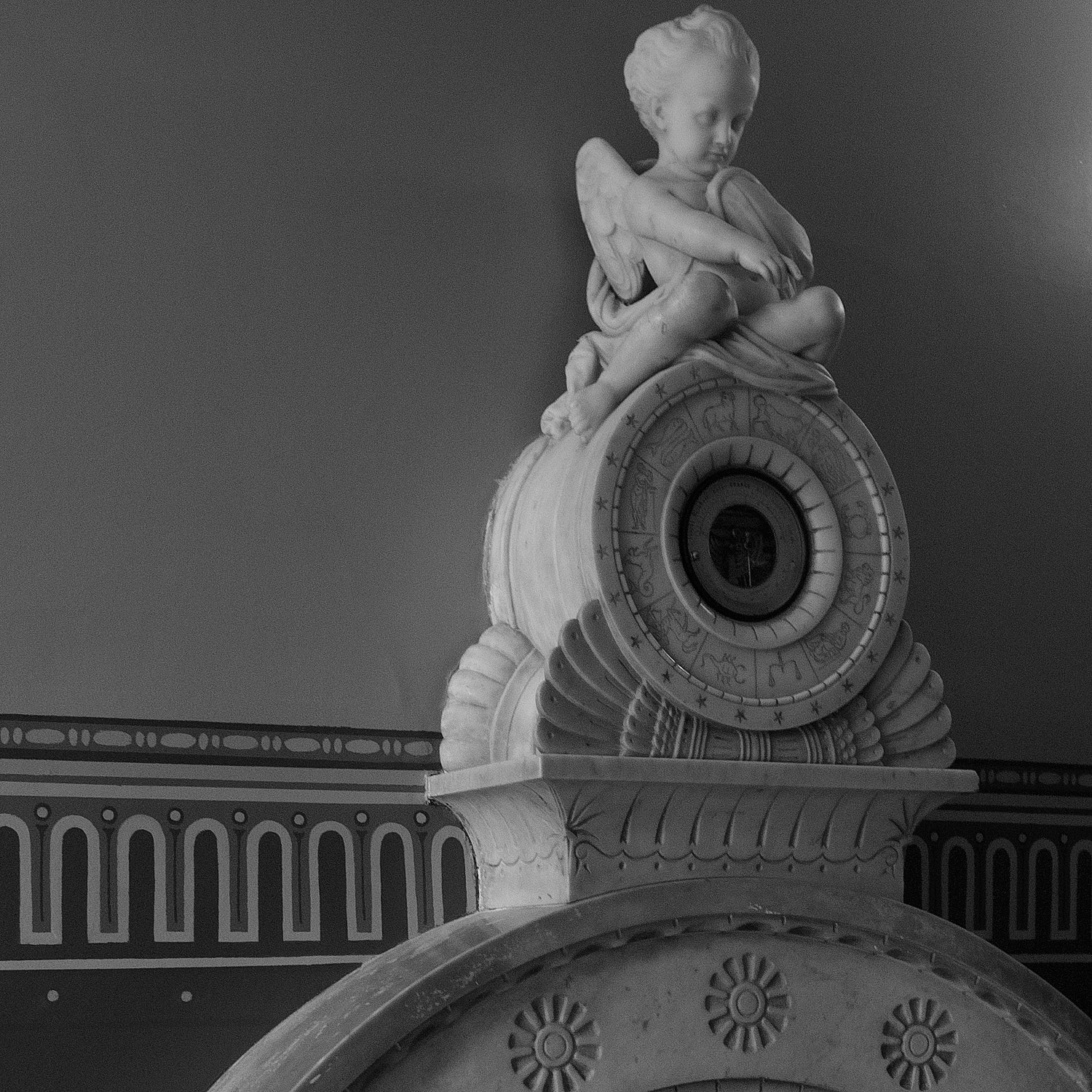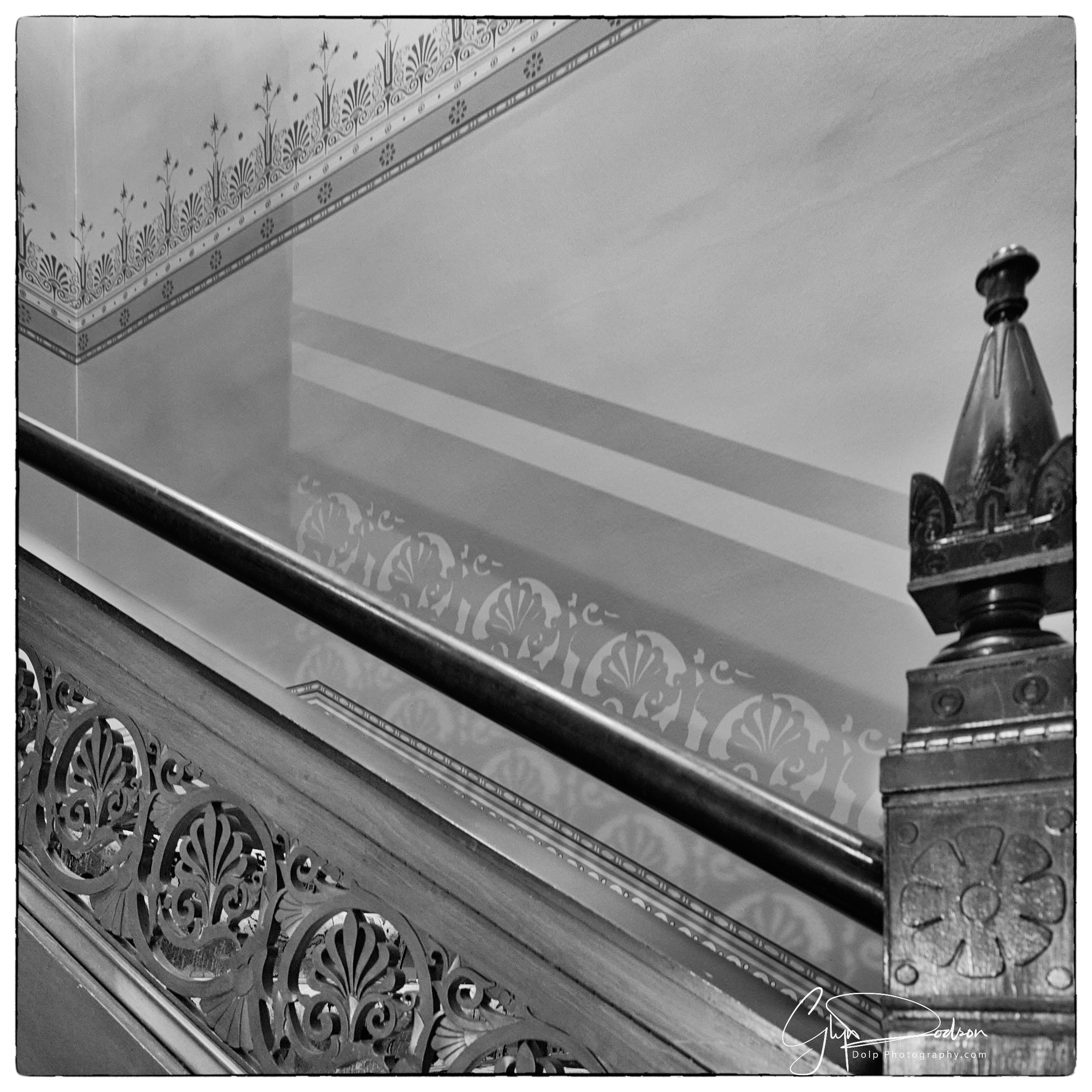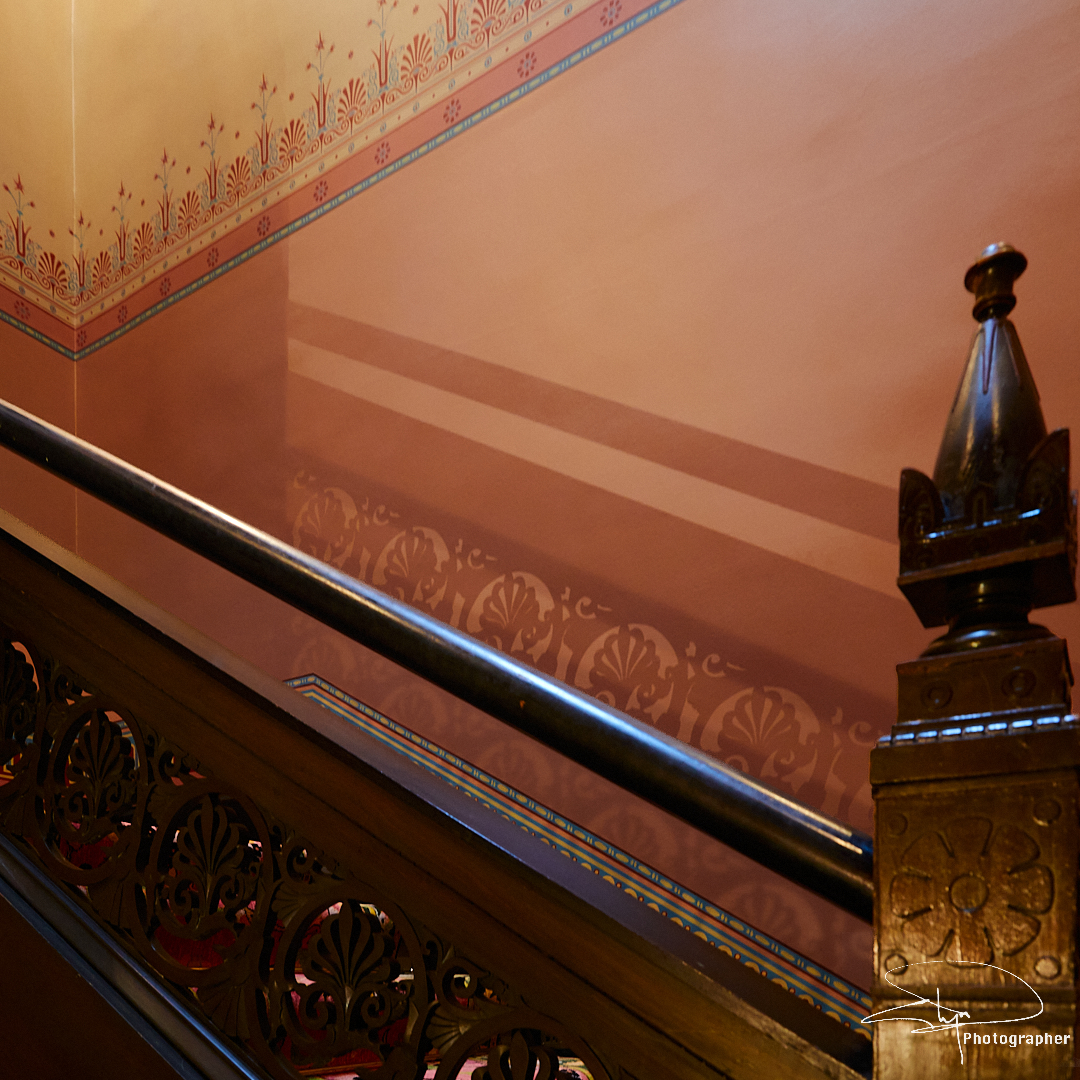 The entrance to Holmwood is the hall, with its magnificent Luna marble fireplace, designed and sculpted by John Mossman (1817-90). Mossman, it would appear, was a friend of Thomson, and sculpted Thomson’s bust, which now resides in the Kelvin Hall Museum. The Hall leads you past the Dining Room to the Parlour. Just before the Parlour is the staircase leading up to the first floor. Standing by the stairs you can see how Thomson used light from the rotunda to illuminate anyone descending the staircase, giving presence and majesty. The detail of the staircase balastrading is quite something.